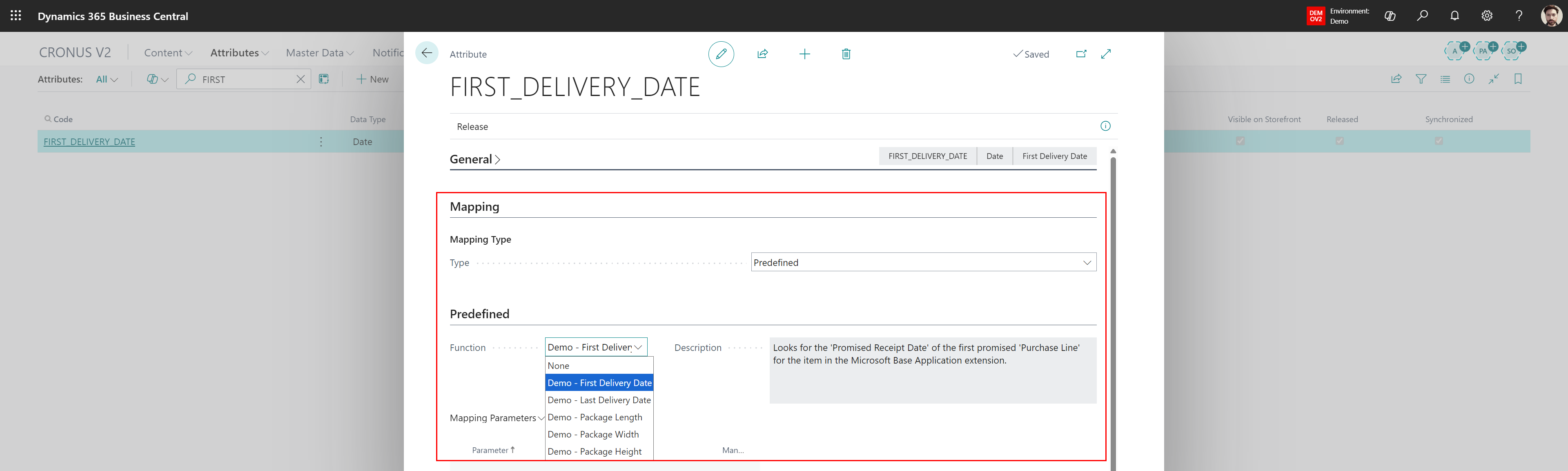 But if you need more flexibility or if you just prefer to code your mapping, then look for the Predefined type. In the example below you see an item attribute FIRST_DELIVERY_DATE which is assigned a predefined mapping.